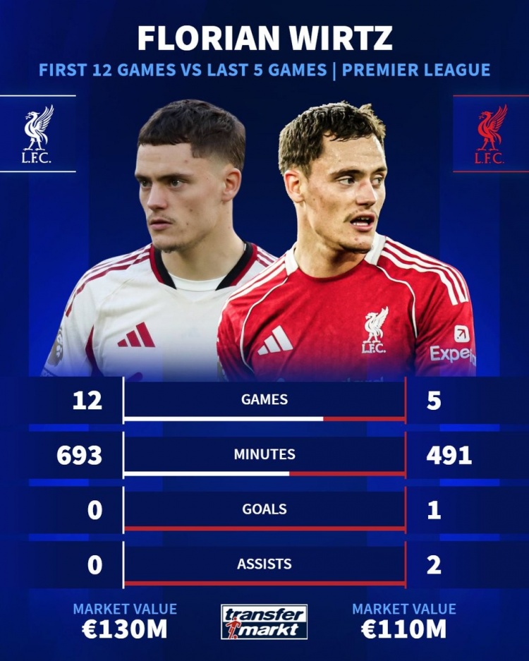 德转也统计对比了维尔茨的英超清晰:前12场出战693分钟法国国家队,孝顺0球0助攻;近5场出战491分钟,已1球2助攻。
