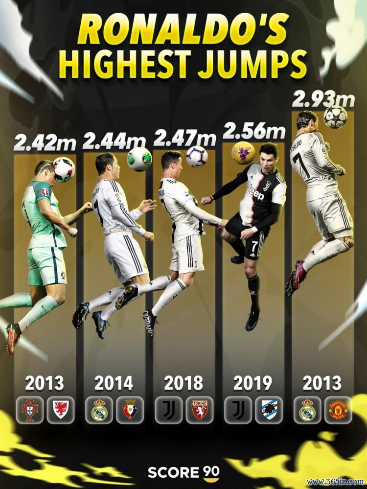 10月12日讯 Score90统计了C罗做事活命于今最高的五次擢升,2013年对阵曼联高度达到2.93米居首。