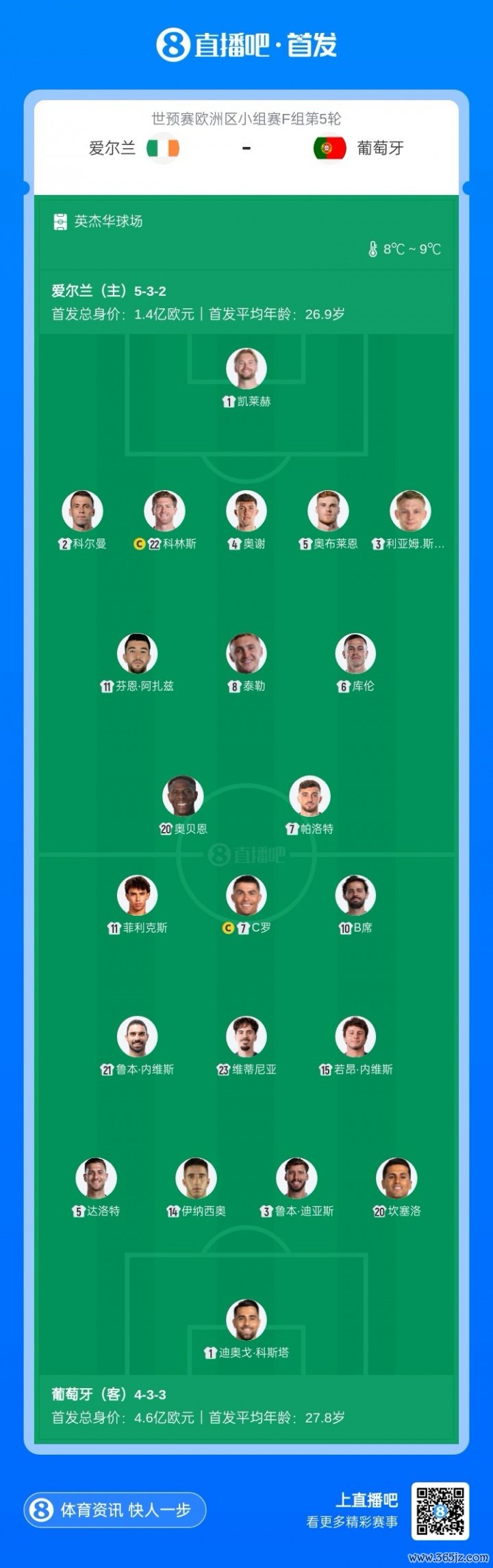 11月14日讯 世初赛欧洲区小组赛F组第5轮,爱尔兰主场迎战葡萄牙,赛前首发名单公布。本场比赛,葡萄牙唯有取胜就能锁定头名晋级寰宇杯。