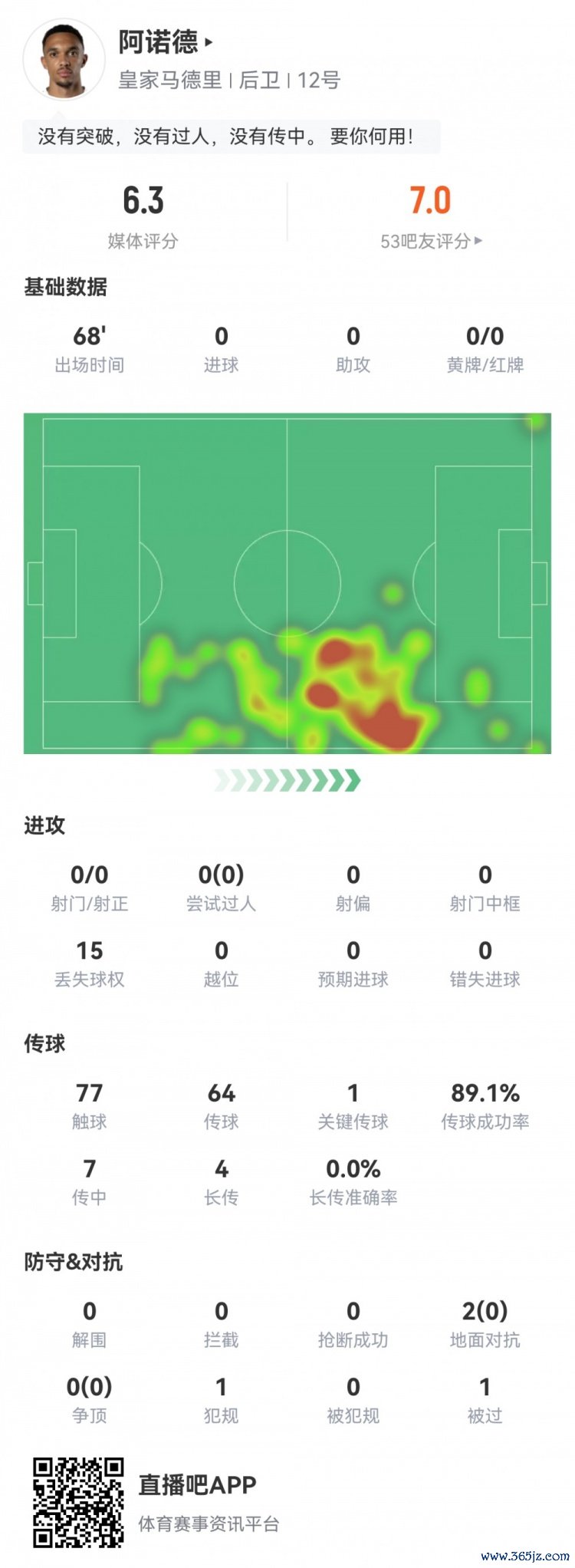 8月20日讯 西甲首轮,皇马暂1-0奥萨苏纳。此役阿诺德西甲首秀68分钟被换下,球员全场重心数据如下↓