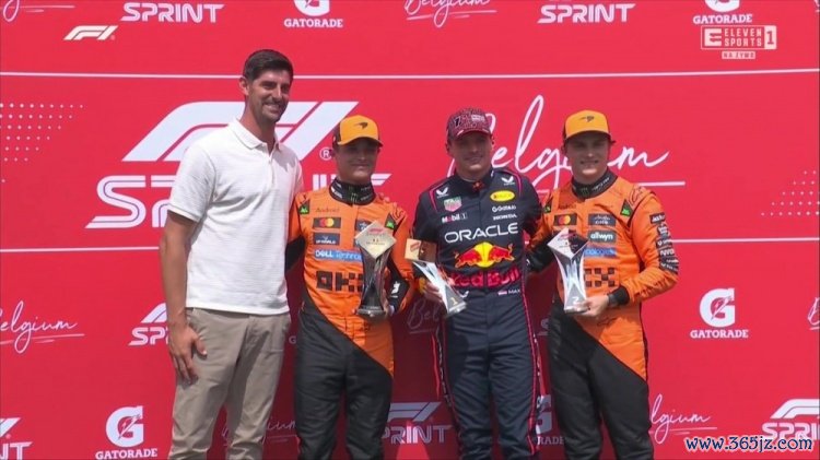 库尔图瓦现场不雅看F1比利时大奖赛,并与冲刺赛领奖台车手维斯塔潘、皮亚斯特里、诺里斯合影。