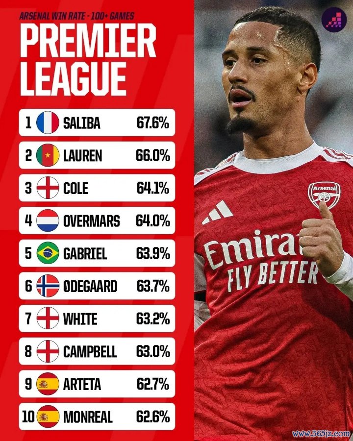 10月1日讯 把柄统计,在为阿森纳出战罕见100场英超的球员中,萨利巴胜率最高,达到67.6%,这位法国中卫已与俱乐部续约至2030年。