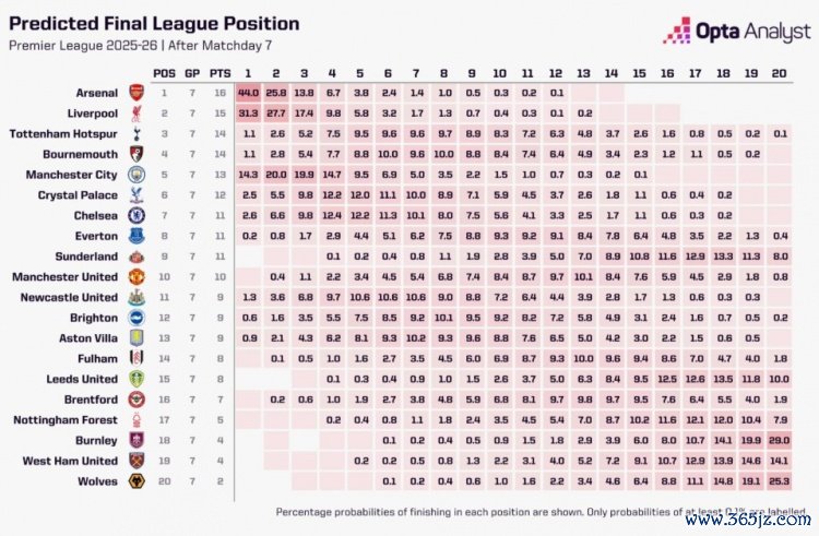 10月15日讯 英超七轮事后,数据机构OPTA超等缠绵机量度本赛季英超冠军↓