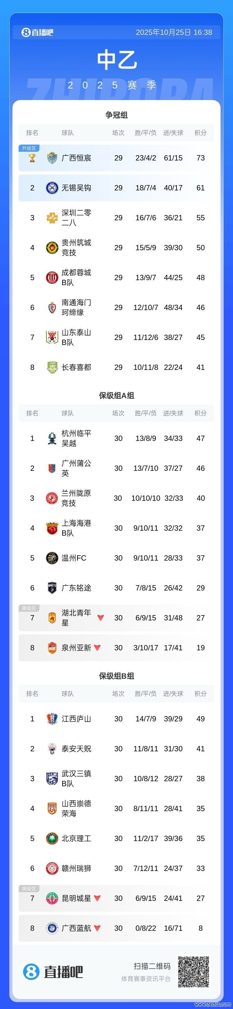 10月25日讯 2025赛季中乙联赛保级组规定系数争夺,保级组A组,湖北后生星、泉州亚新左迁,保级组B组,昆明城星、广西蓝航左迁。