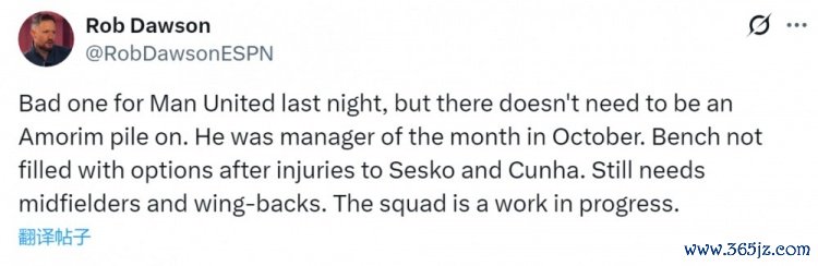 关于曼联的失利,记者Rob Dawson社媒写谈:“曼联昨晚输球如实很厄运,但没必要对阿莫林群起而攻之,他关联词十月份的月度最好主帅。”