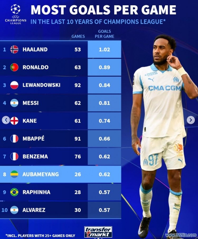11月26日讯 马赛在本轮欧冠2-1逆转纽卡斯尔,奥巴梅扬梅开二度。《转会市集》统计浮现,他亦然近10年欧冠场均进球榜前十。