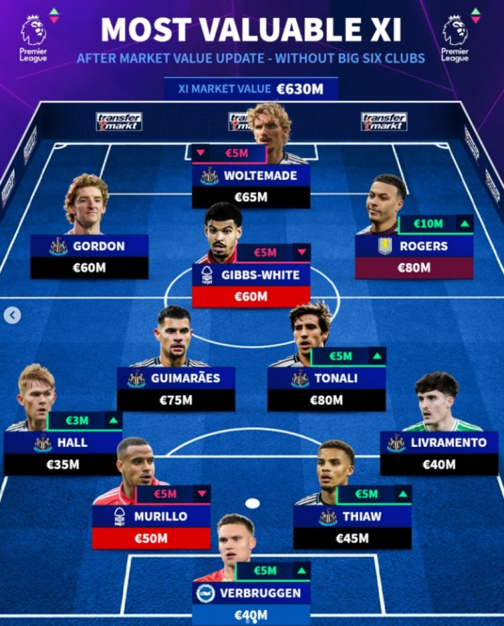直播吧3月10日讯德转在北京时间3月9日更新了英超球员身价,并列出了更新后无big6球员在内的身价最贵阵容,托纳利、摩根·罗杰斯8000万欧领衔,纽卡7人在列,总身价6.3亿欧。
