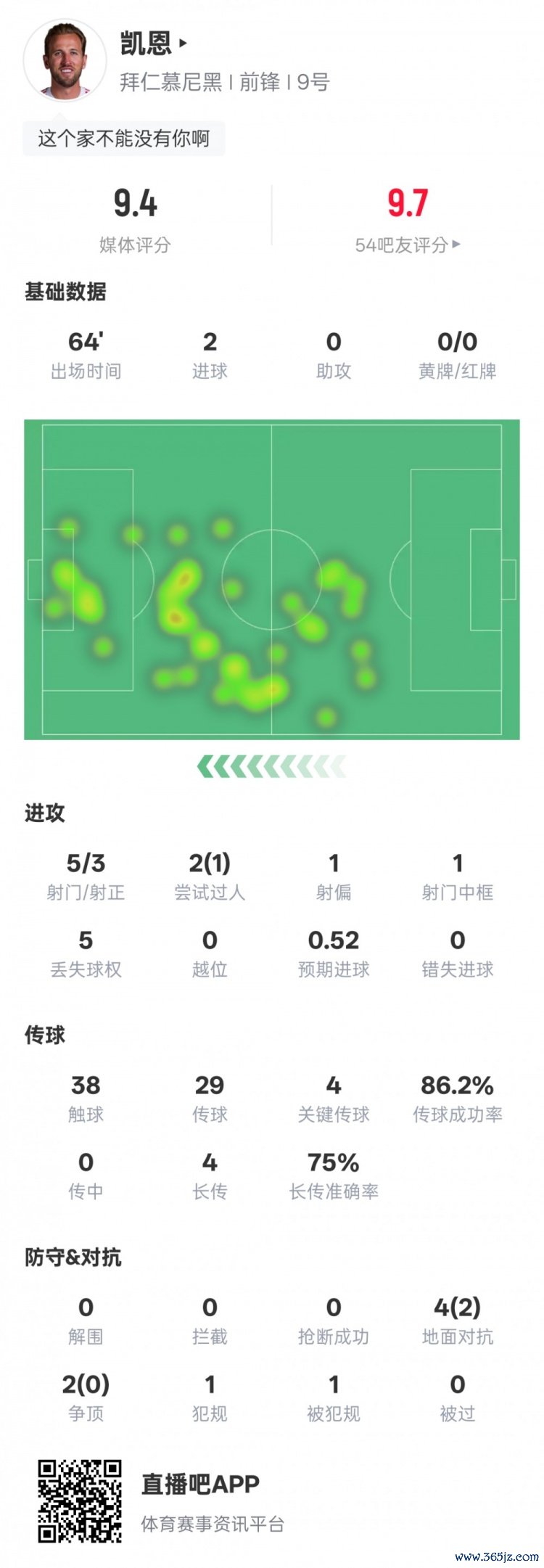 凯恩本场比赛具体数据如下: