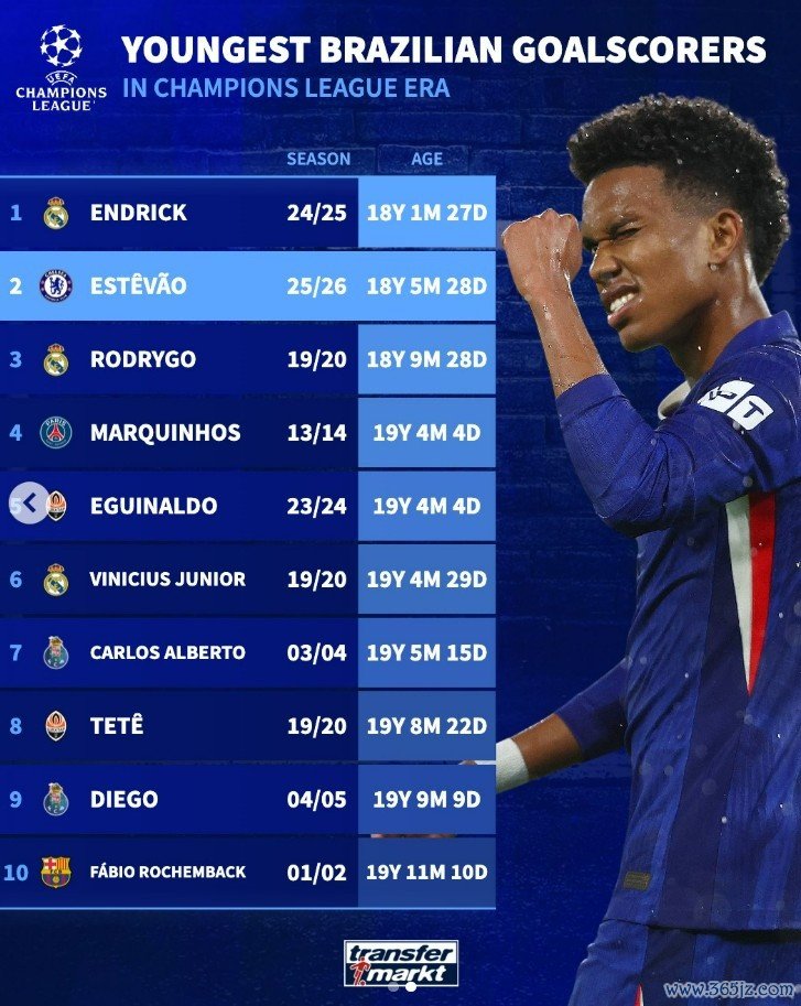直播吧10月23日讯在本轮欧冠切尔西5-1大捷阿贾克斯的比赛中,埃斯特旺破门。德转也清点了欧冠改制以来巴西最年青进球球员榜单,具体如下: