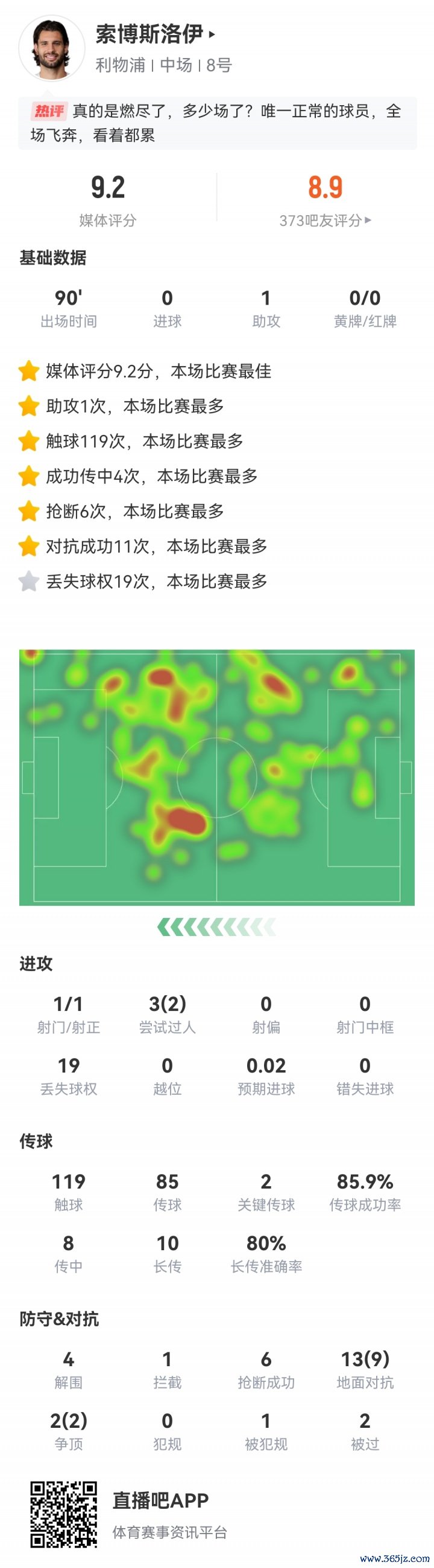 本赛季索博斯洛伊号称利物浦的劳模,除了一场联赛杯其余13场比赛他一都踢满全场,以致一经踢了中场、右边后卫、前腰、后腰4个位置。本场比赛他的热区图又果然笼罩了全场。