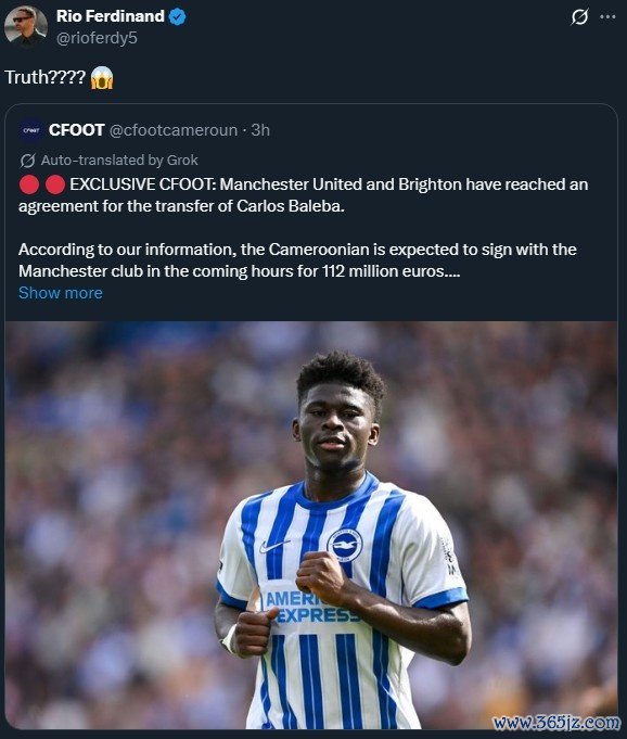 喀麦隆媒体CFOOT报说念称,曼联仍是与布莱顿就巴莱巴转会好意思满公约,球员瞻望将在将来几个小时与曼联签约,用度1.12亿欧元。