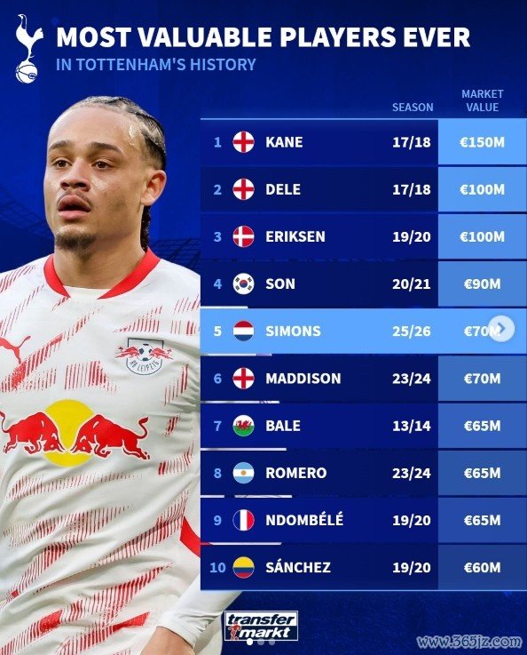 8月30日讯 本周五,热刺官方晓谕以6000万欧元从莱比锡签下哈维-西蒙斯。笔据德国转会商场提供的数据,西蒙斯的身价为7000万欧元,在热刺队史足以排在第5位。
