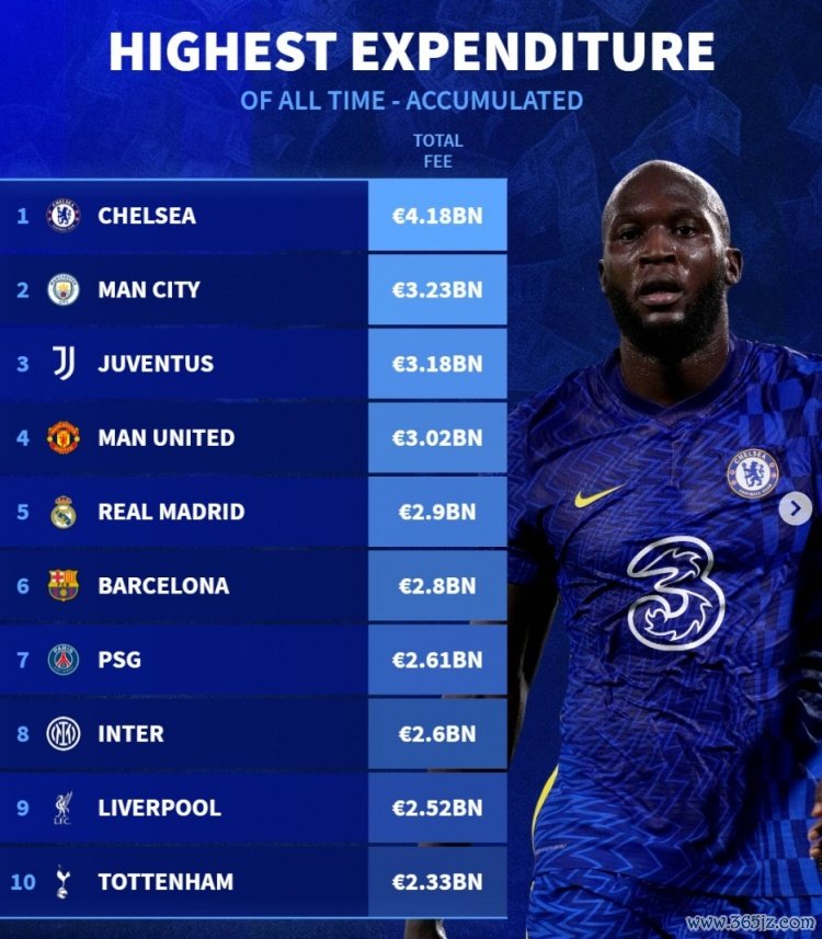 7月25日讯 《转会阛阓》统计了各队历史转会费总支拨情况,切尔西独自领跑。