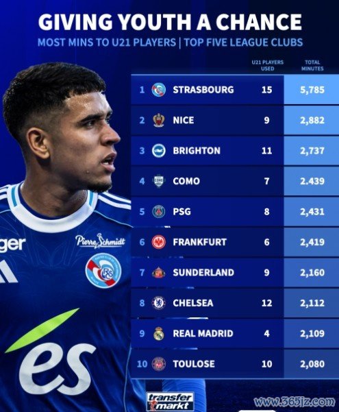 10月17日讯 德国转会商场盘货了本赛季五大联赛各俱乐部U21球员上场时辰情况,斯特拉斯堡以5785分钟高居榜首,布莱顿以2737分钟位居第三。