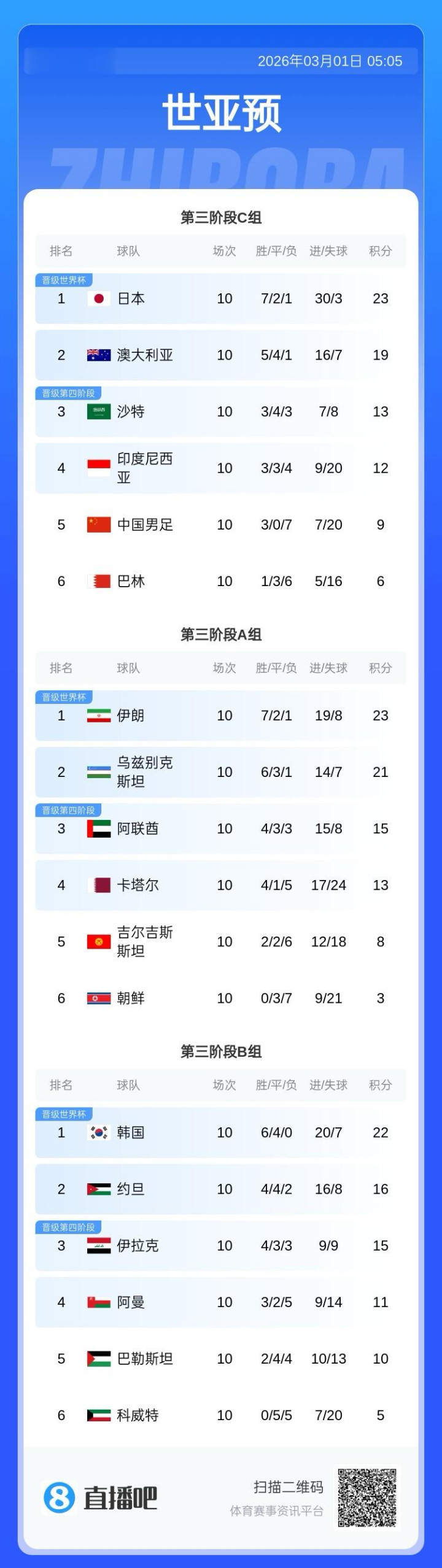 世预赛亚洲区3阶段足球球队排名: