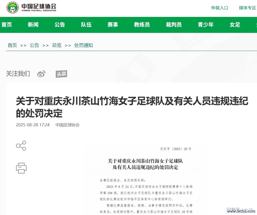 近日,中国足协针对杭州银行女足主场与永川茶山竹海女足赛后突破,开出重磅罚单。